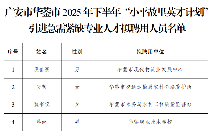 广安市华蓥市2025年下半年“小平故里英才计划”引进急需紧缺专业人才拟聘用人员公示