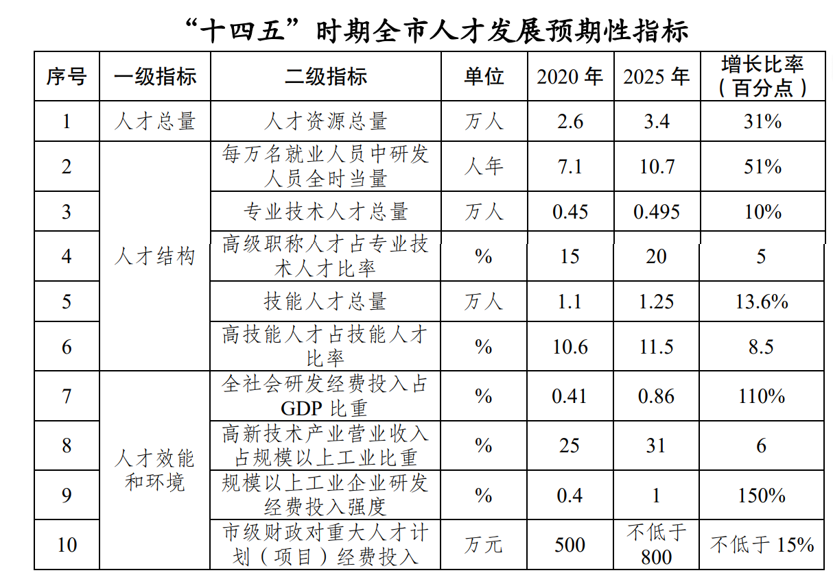 端专家人才、硕博人才和高技能人才。到“十四五”末,全市 人才资源总量增加到 3.4 万人,科技创新主力军队伍实力显著增强,人才队伍更加适应经济社会高质量发展需要。